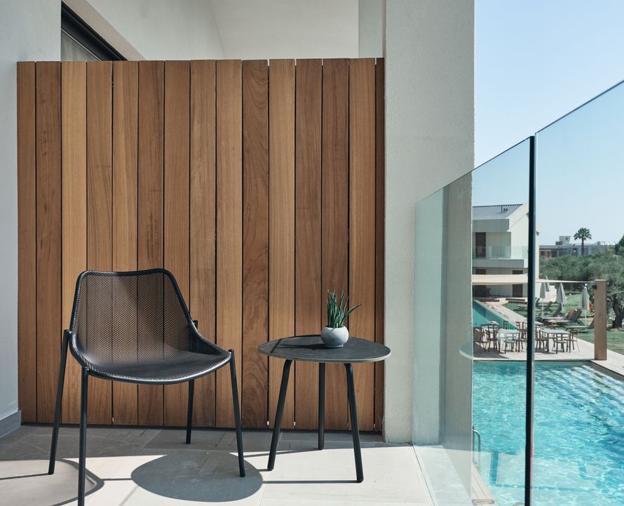 Το Aqua Bay Suites χαρακτηρίζεται από την χρήση γκρι κεκλιμένων στεγών που συνδυάζουν μοντέρνα αισθητική και λειτουργικότητα. Ο σχεδιασμός προωθεί την άνεση και την κομψότητα.