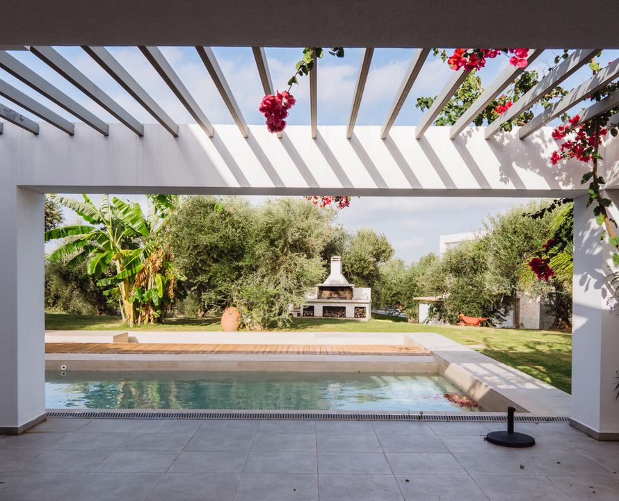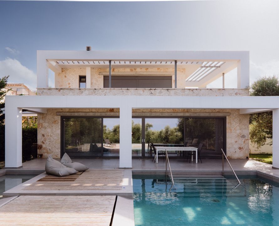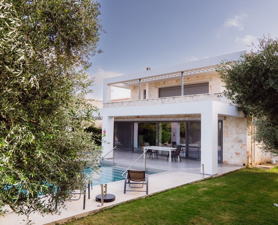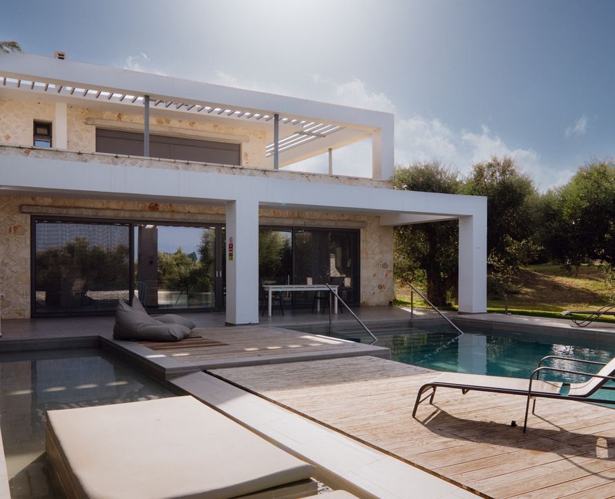 Τέσσερις βίλες σε ελαιώνα με φυσική πέτρα και παραδοσιακή αρχιτεκτονική. Οι πέργκολες δημιουργούν σκίαση και αρμονία με το περιβάλλον.