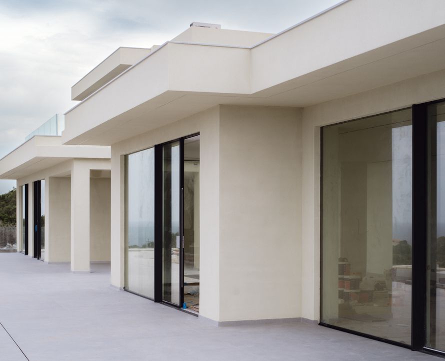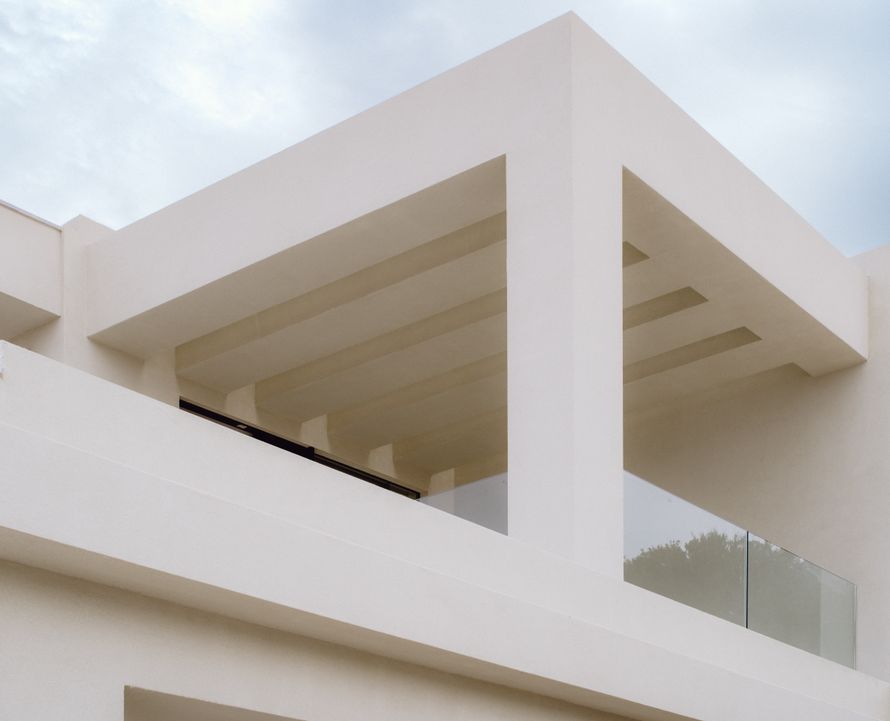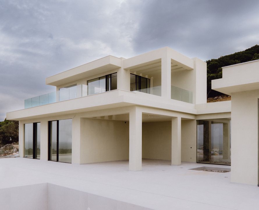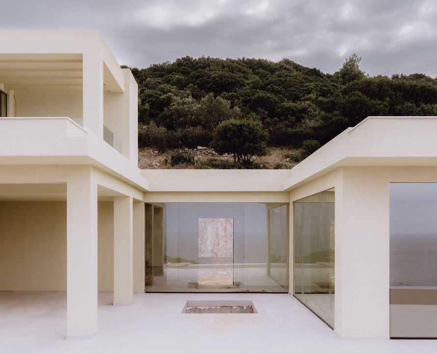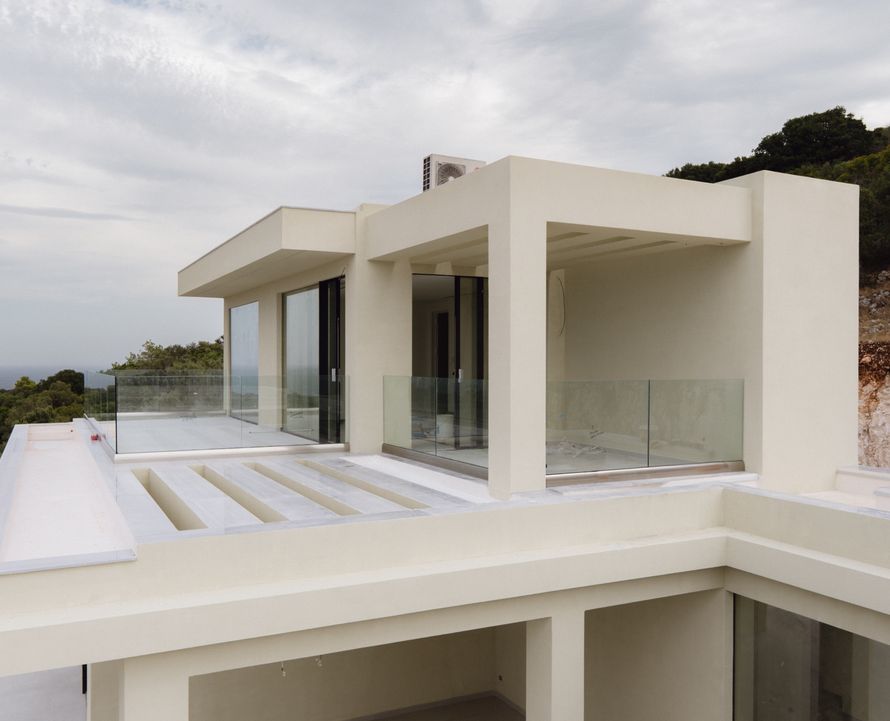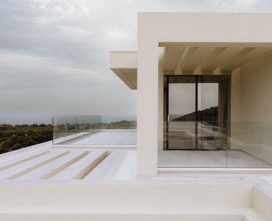 Μινιμαλιστικός σχεδιασμός με πέργκολες και γεωμετρικές γραμμές. Μεγάλα ανοίγματα προσφέρουν φωτεινότητα και θέα στη φύση.