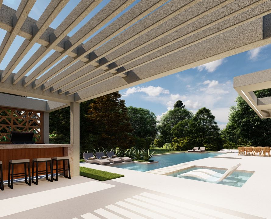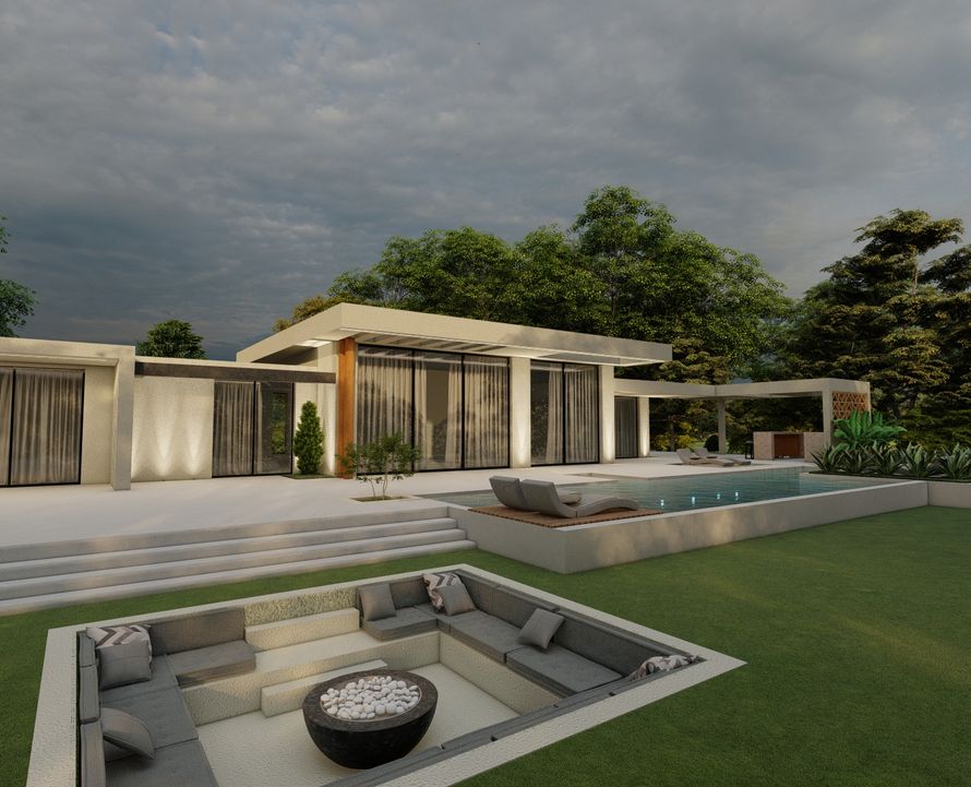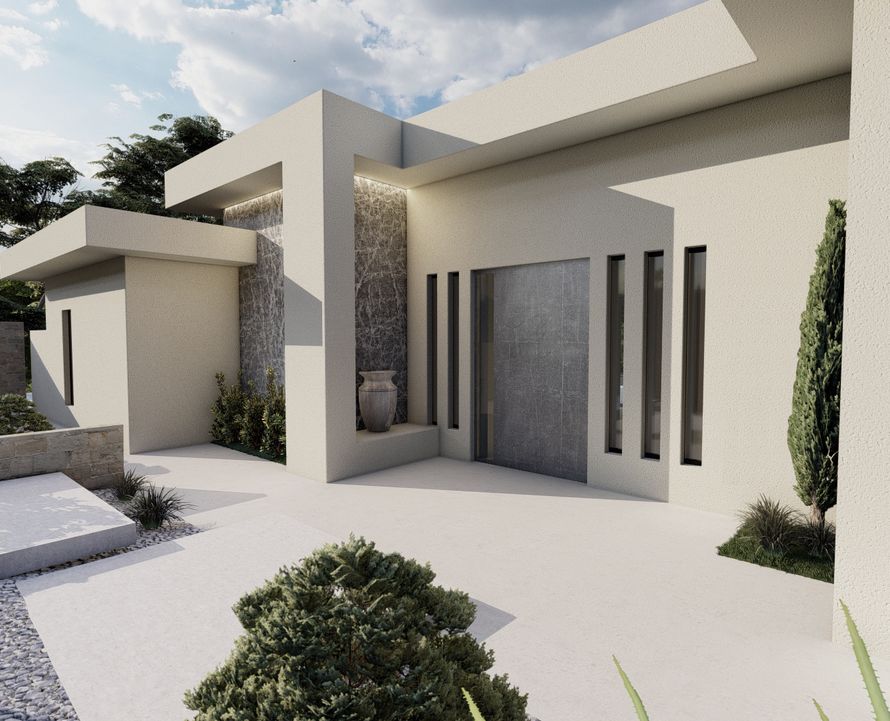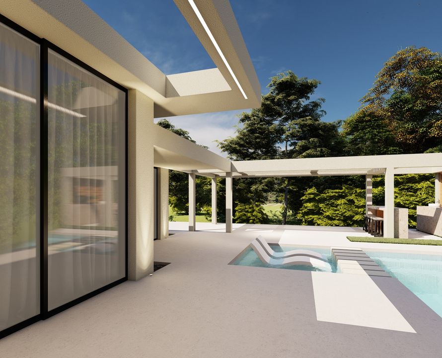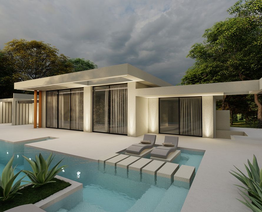 Ισόγεια βίλα με σύγχρονο σχεδιασμό, ενιαία θέα από όλα τα δωμάτια. Περιλαμβάνει πισίνα, τζακούζι, και εξωτερικούς χώρους για κοινωνικές εκδηλώσεις.